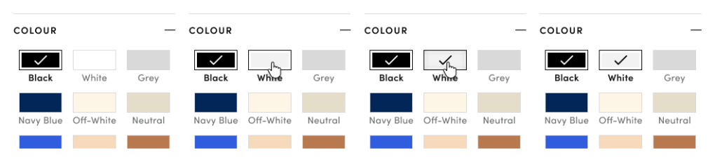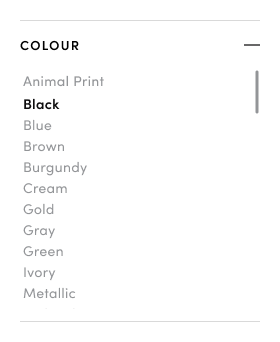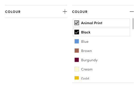 While not unique to the colour filter, this issue is worth highlighting. On mobile devices especially, the use of the “—” symbol would lead users to believe that the filter can be collapsed when in fact, it does nothing. This could result in confusion or frustration during navigation.