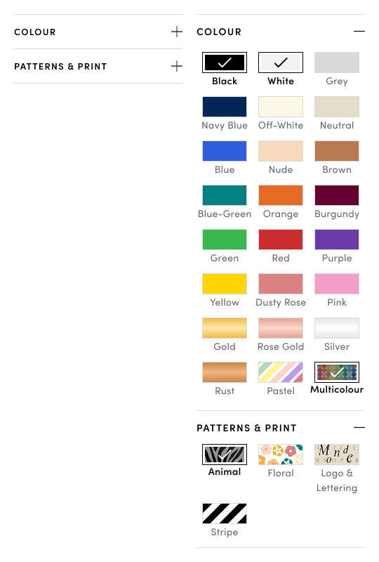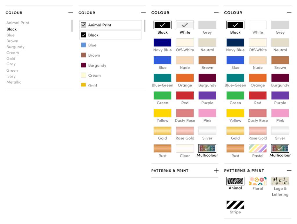 - Dedicated “Patterns & Prints” filter to highlight high-interest print types. Although most patterns proposed in version 3 weren’t consistently reflected in the store-provided product data, we were able to extract reliable tags for the most popular prints—Animal, Floral, and Stripe. Given that the Colour filter was already visually optimized for scannability, and to avoid overwhelming users with excessive scrolling, separating Patterns & Prints into its own filter ensured better usability and discoverability.