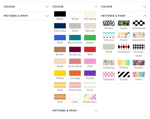 - Colour order was reorganized into a visually intuitive rainbow-like layout, with the most popular colours placed near the top. Patterns and prints remained in alphabetical order, as popularity may vary across product categories.