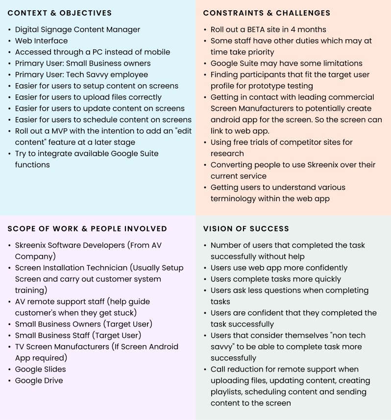 The AV company I worked with has extensive experience installing digital signage hardware but frequently encountered ongoing support requests due to the limitations and inconsistencies across third-party CMS tools. To address these recurring challenges, the team decided to develop its own custom web-based signage CMS called “Skreenix”. I used this real-world scenario as the foundation for my UX project, taking ownership of the research, design, and prototyping work shown below.
