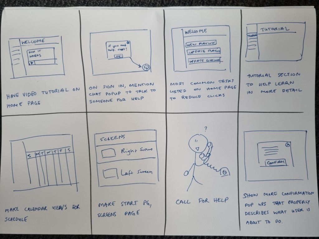 - All participants struggled with properly understanding common terminology across these sites and how they link to the physical screen (E.g. playlist, groups, schedules)