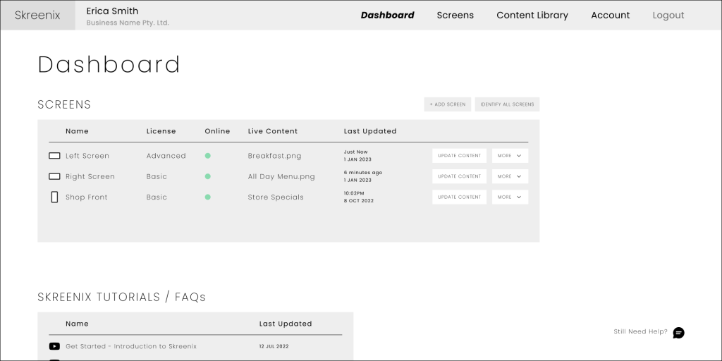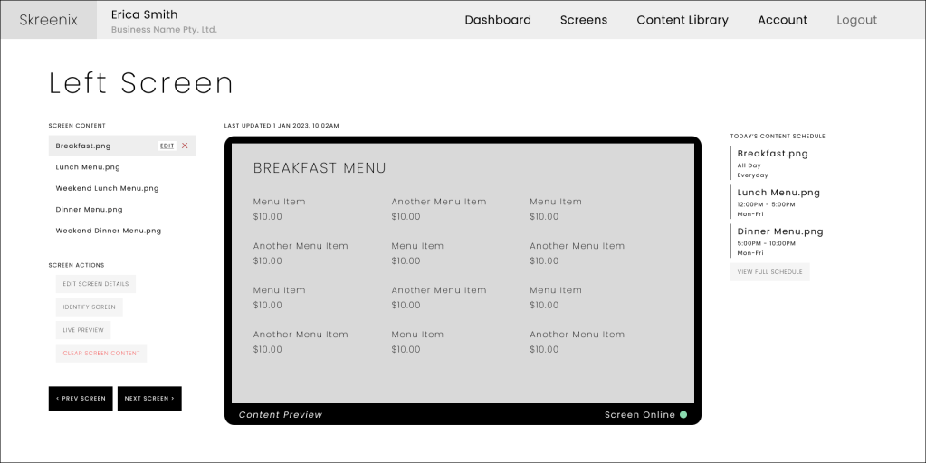 Skreenix is a custom SaaS-based CMS designed to help small business owners manage digital signage content with ease. Initially based on a real-world business challenge from an AV company I worked with, I used this scenario as the foundation for my UX project during RMIT’s UX/UI Design course. Following the course, I further refined the design in collaboration with the company’s back-end developer and lead AV technician. While development was later paused due to shifting business priorities, the project reflects a realistic MVP shaped by technical constraints and user needs.